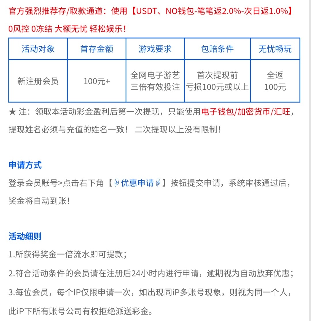 新注册24小时内,会员首存100元+并完成存款的三倍或以上有效投注,首次提现前亏损100元或以上,即可申请全返本金100元包赔福利。