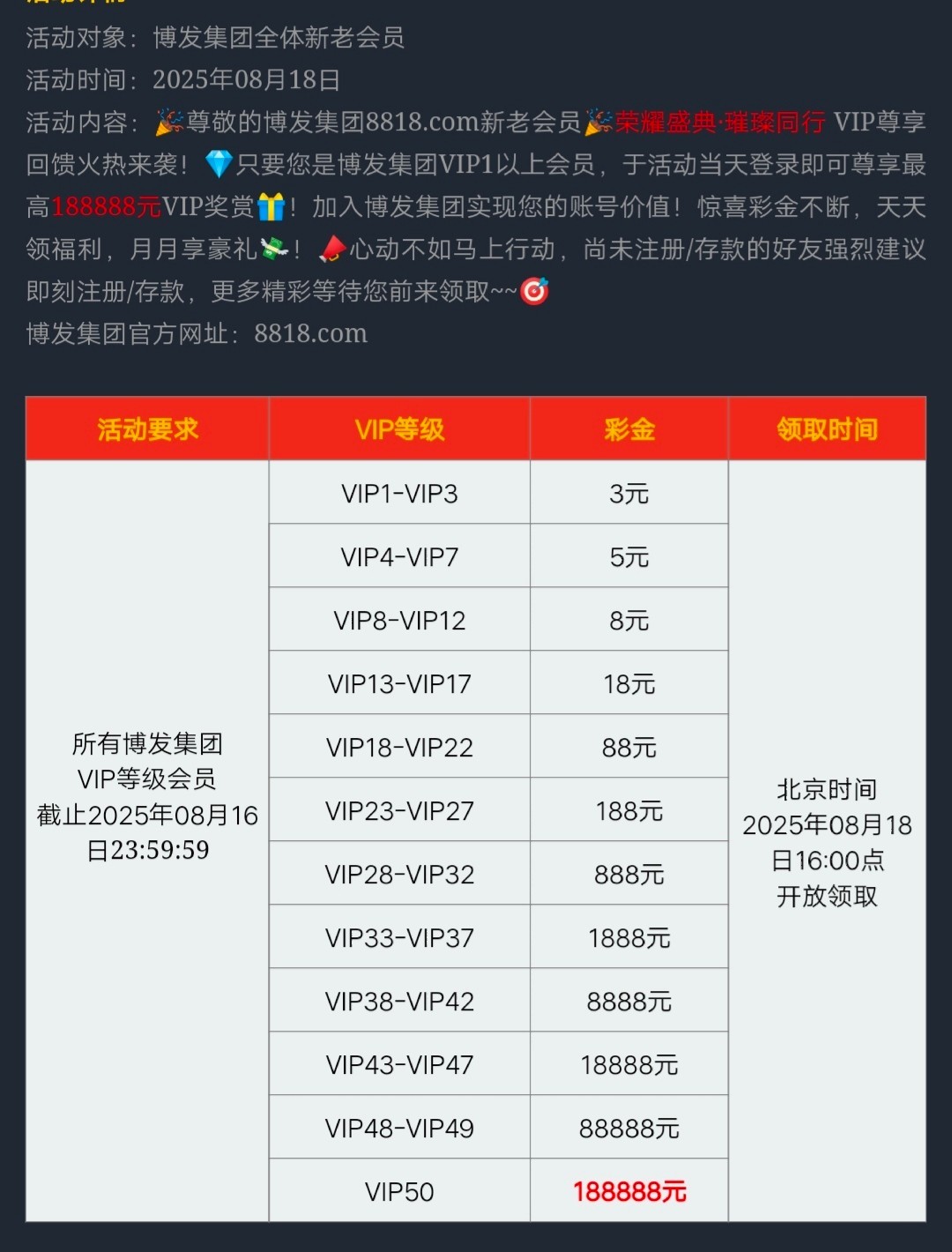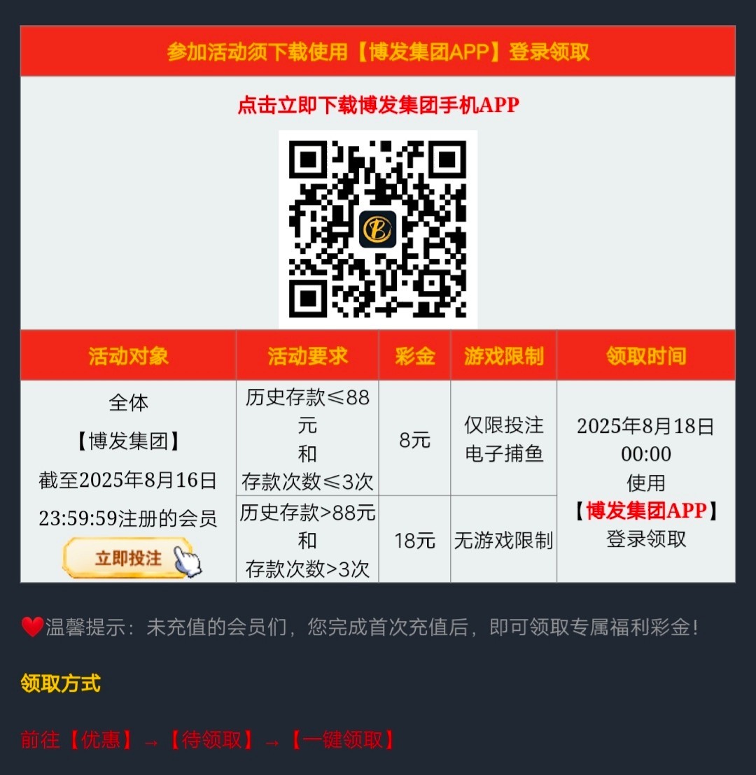 截止8月16日23:59前注册的会员,享有8元/18元的回馈金,出款流水详情看规则介绍;