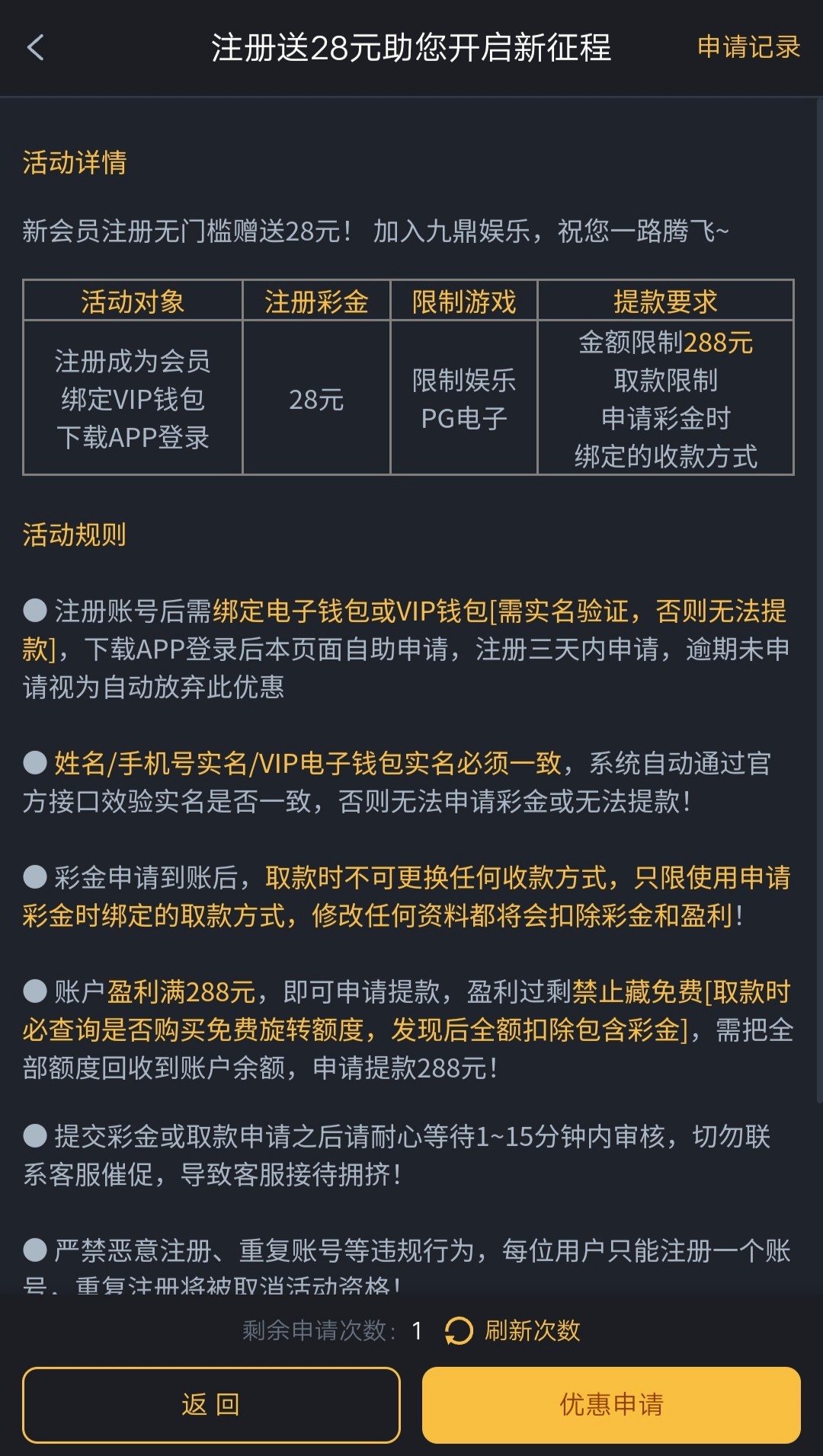 新玩家注册下载绑定VIP钱包,自助申请28元彩金,规则看活动介绍。